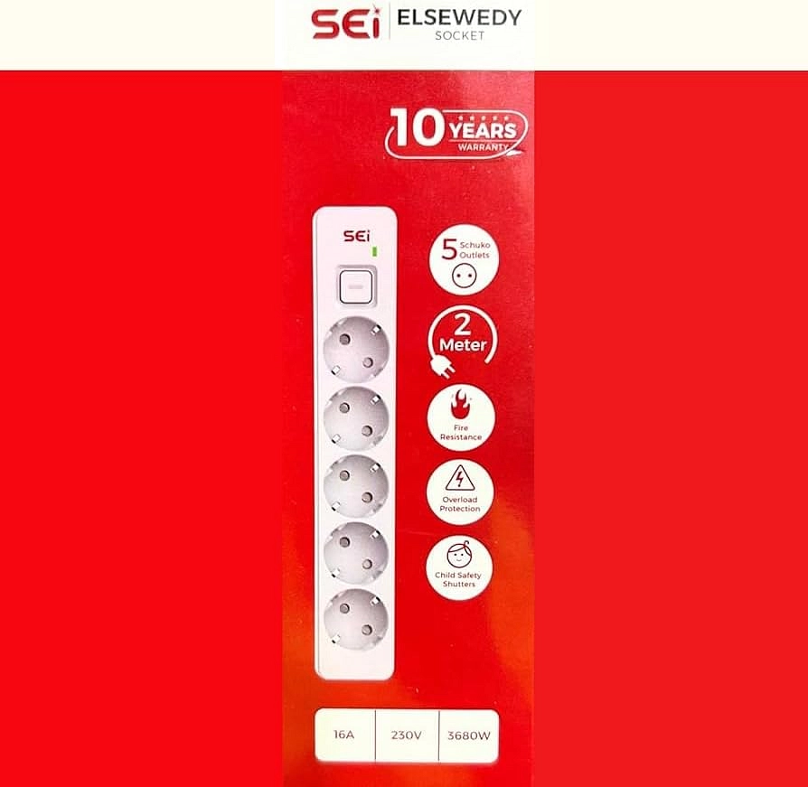 مشترك السويدي كهربائي ٥ مخارج، طول ٢ متر، ٢٣٠ فولت، ١٦ أمبير، أبيض