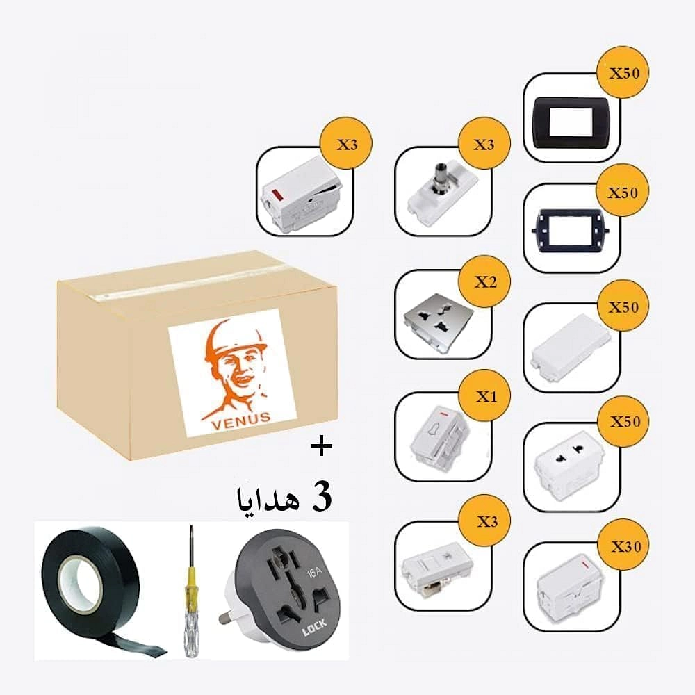 حزمة تشطيب كهربائية من فينوس - 50 وات - 50 هيكل - 50 لقمة ريش - 30 لقمة مفتاح - 50 مقعد - 3 رؤوس دش - 3 رؤوس هاتف - 3 مفاتيح لمبة - 2 بريزة ثلاثية - جرس زر واحد)